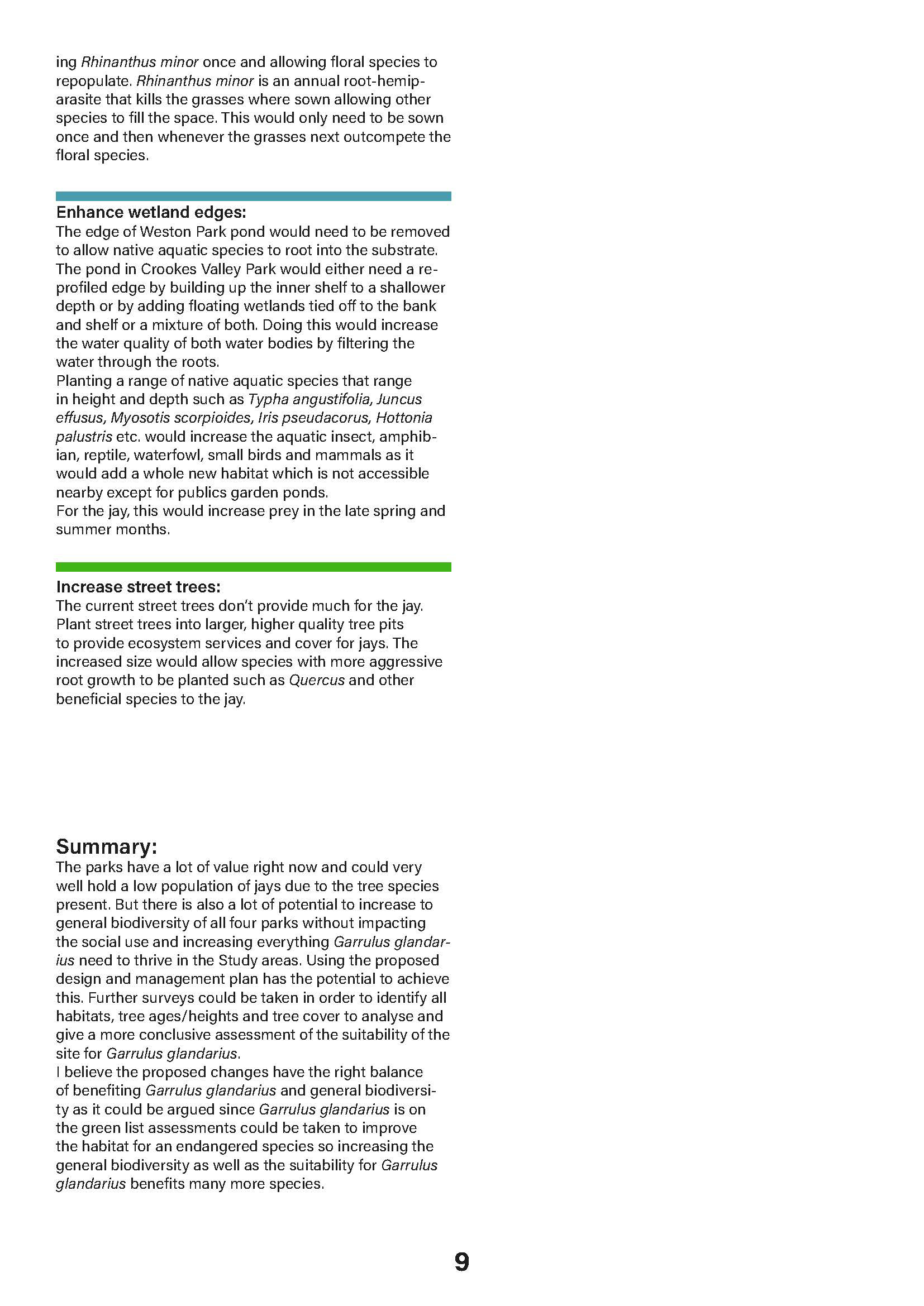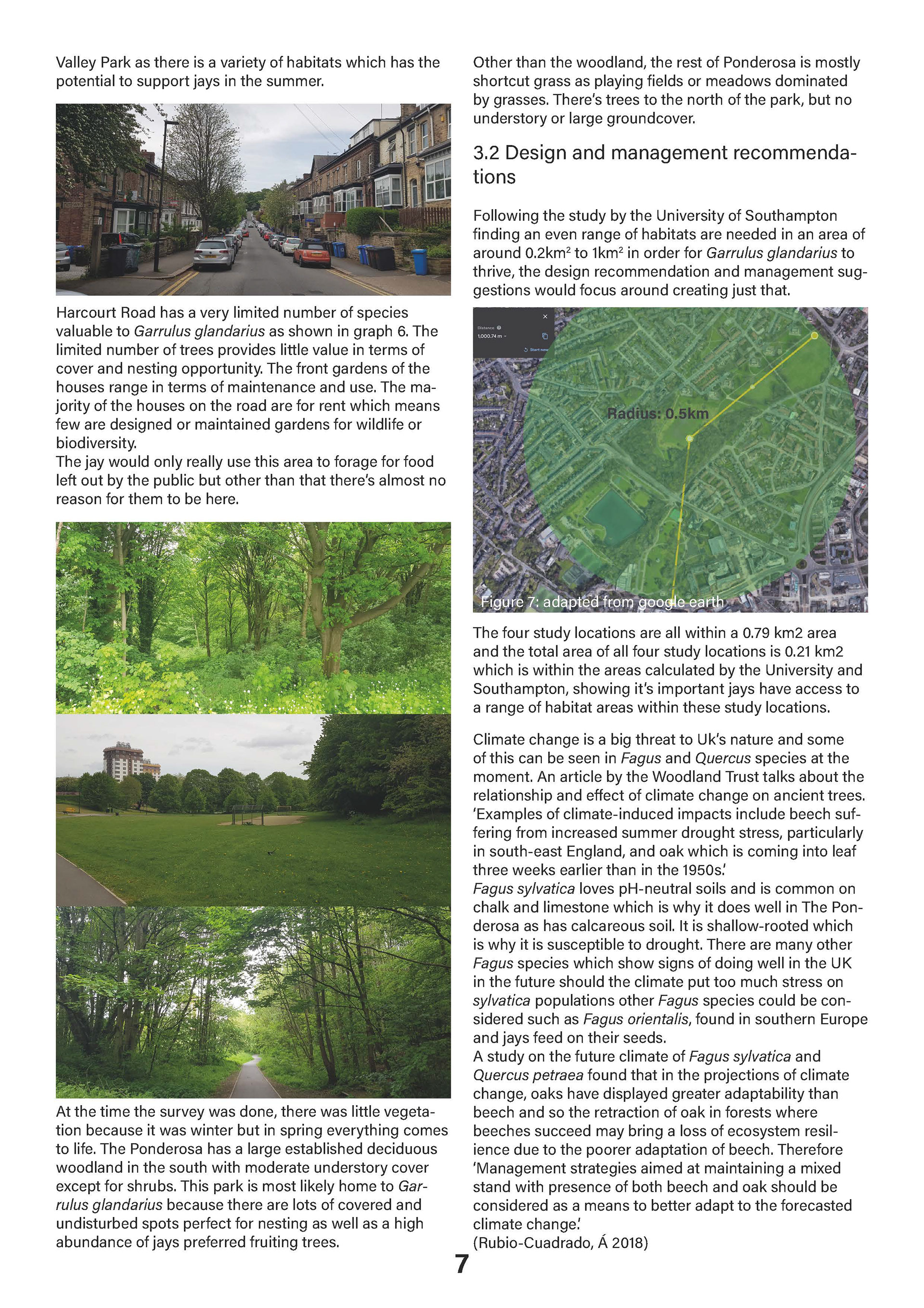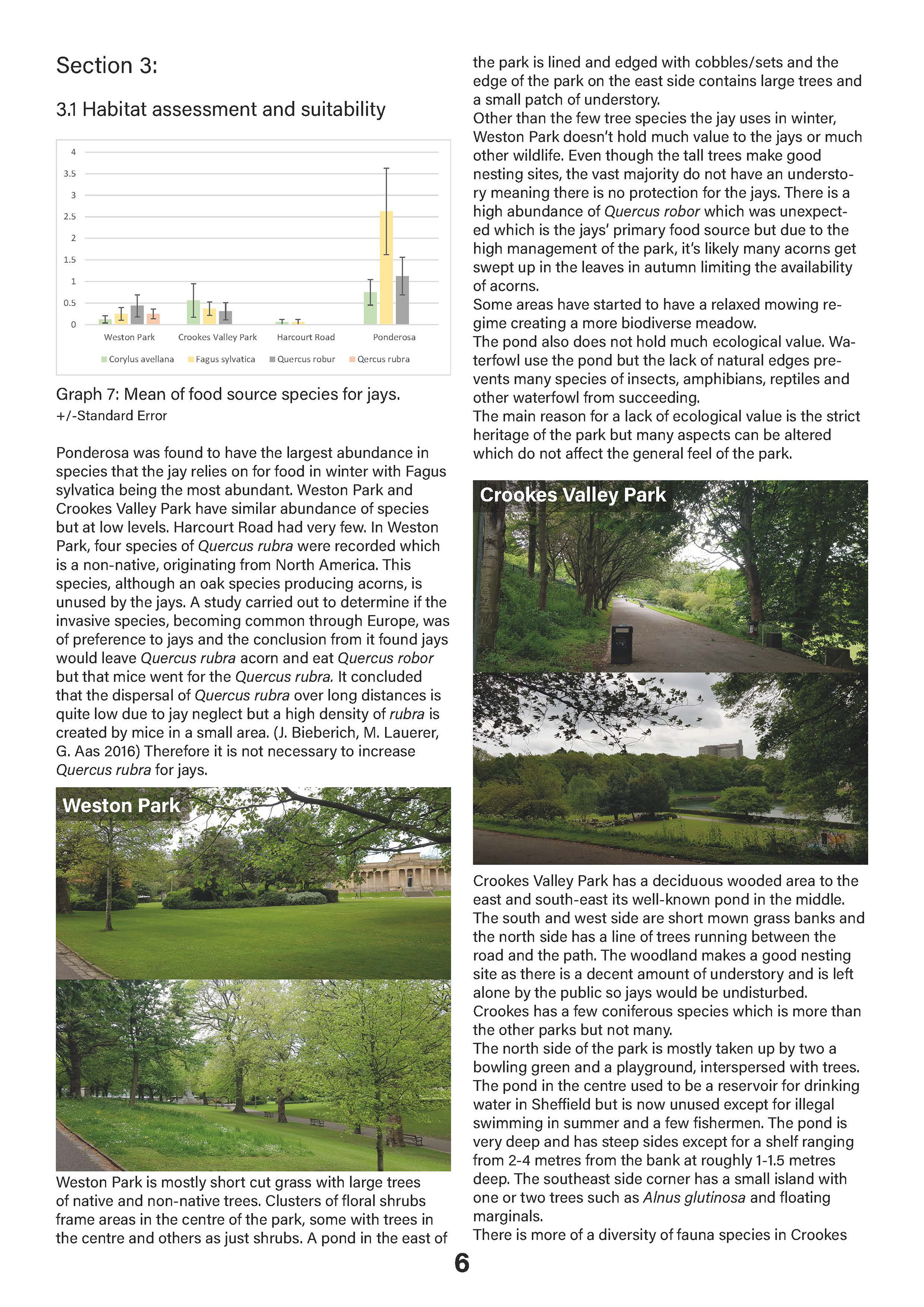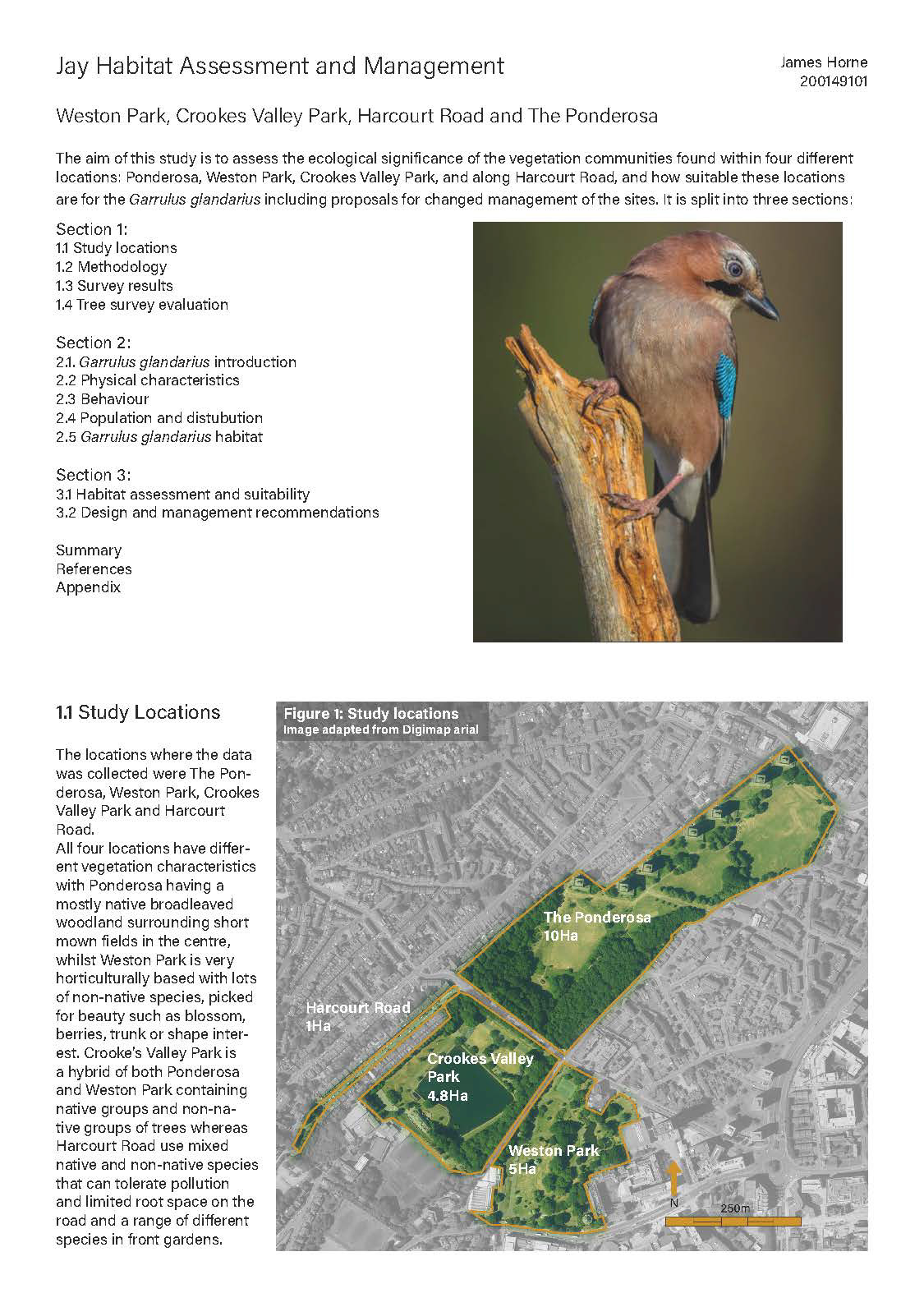 Ecology module looking at the suitability of Weston Park, Crookes Valley Park, Harcourt Road and the Ponderosa in Sheffield for the Jay (Garralus glandarius).